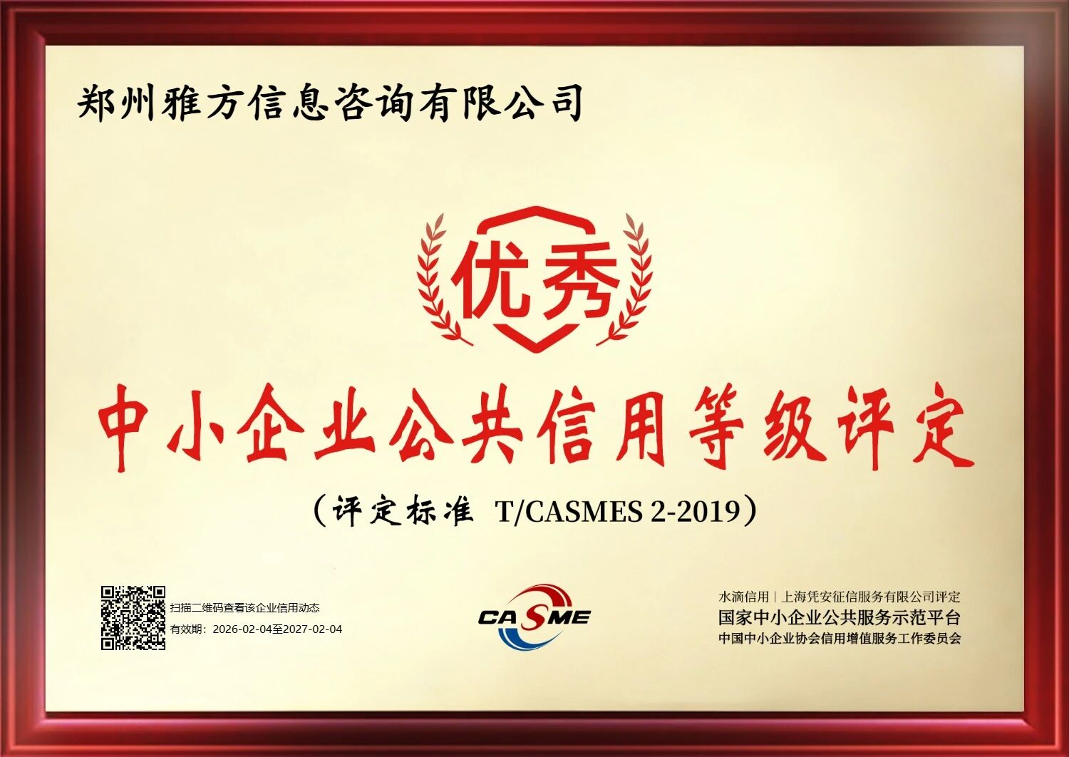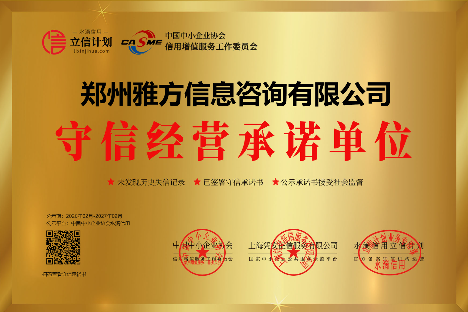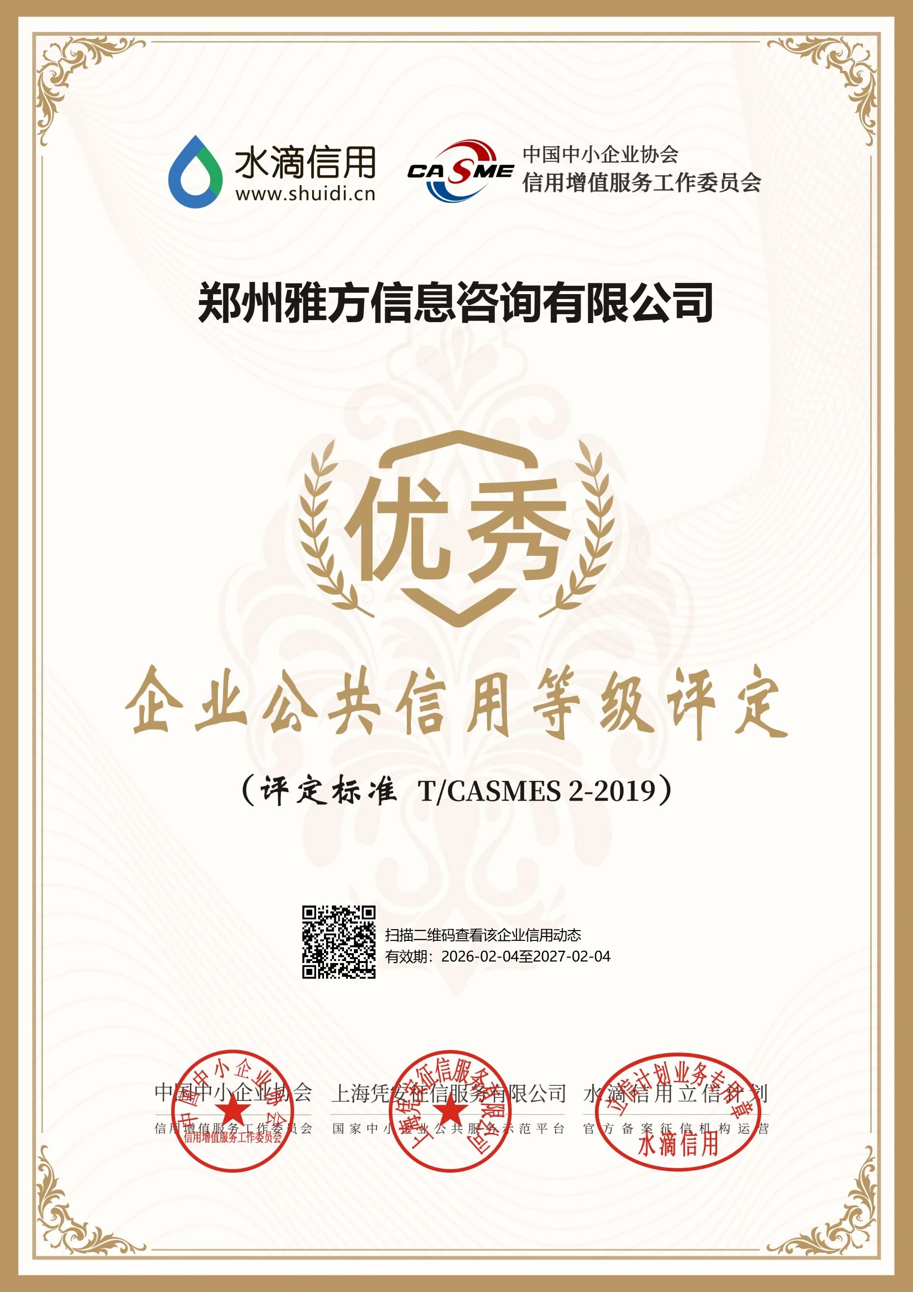 2026年2月,雅方咨询凭借规范的经营管理、良好的市场信用口碑,在水滴信用立信计划中小企业公共信用等级评定中,获评“优秀”等级,同时成为经官方认证的守信经营承诺单位,彰显出企业深耕行业多年的诚信经营硬核实力。